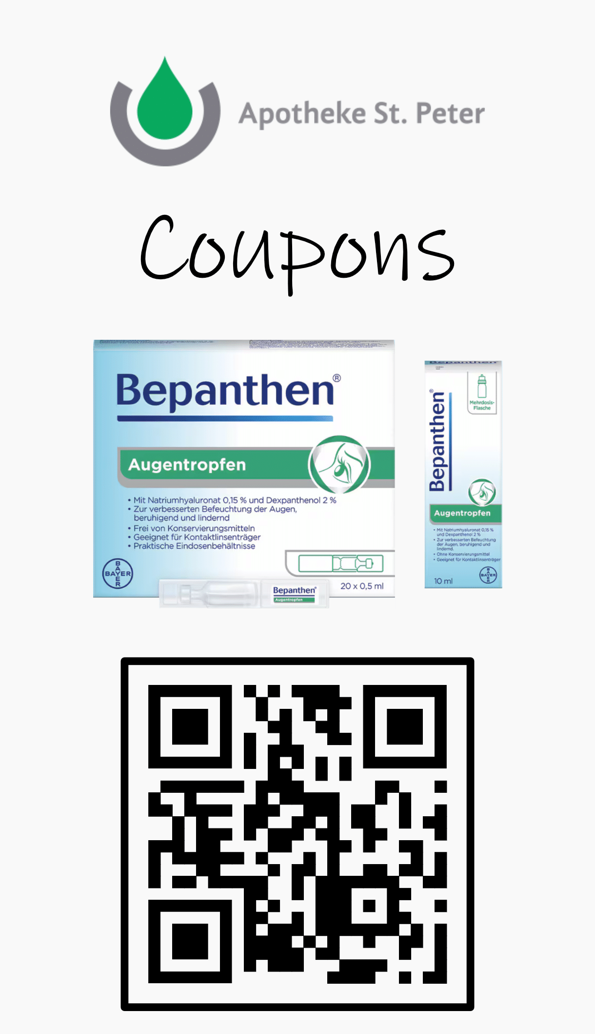 Beim Kauf von Bepanthen® Augentropfen oder Bepanthen® Augentropfen intense erhalten Sie einen Sofort-Rabatt in Höhe von 3 €. Der Rabatt wird beim Einkauf automatisch an der Kasse abgezogen. Nur ein Rabatt pro Einkauf. Nicht mit anderen Aktionen kombinierbar. Vervielfältigungen werden nicht akzeptiert. Eine Barauszahlung erfolgt nicht. Nur in teilnehmenden Apotheken innerhalb Deutschlands.