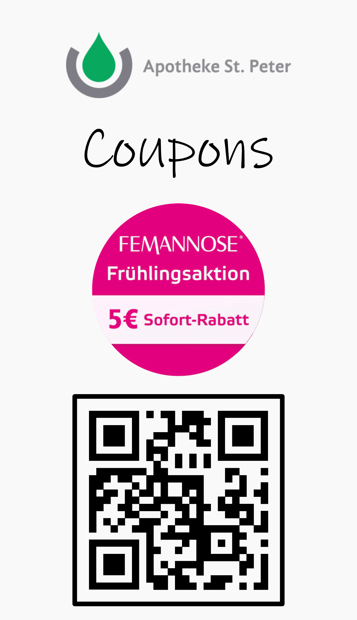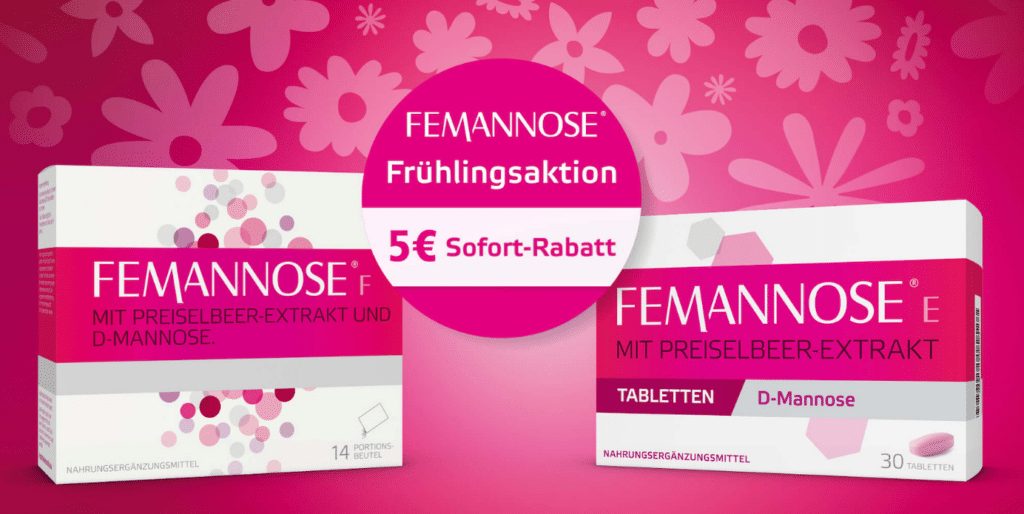 Beim Kauf eines Produkts der Marke FEMANNOSE® erhalten Sie ab einem Wert von 20 € gegen Vorlage des Coupons einen Rabatt in Höhe von 5 € direkt an der Kasse. Nur ein Coupon pro Kauf einlösbar. Nicht mit anderen Aktionen kombinierbar. Vervielfältigungen werden nicht akzeptiert. Eine Barauszahlung erfolgt nicht. Nur in teilnehmenden Apotheken innerhalb Deutschlands.