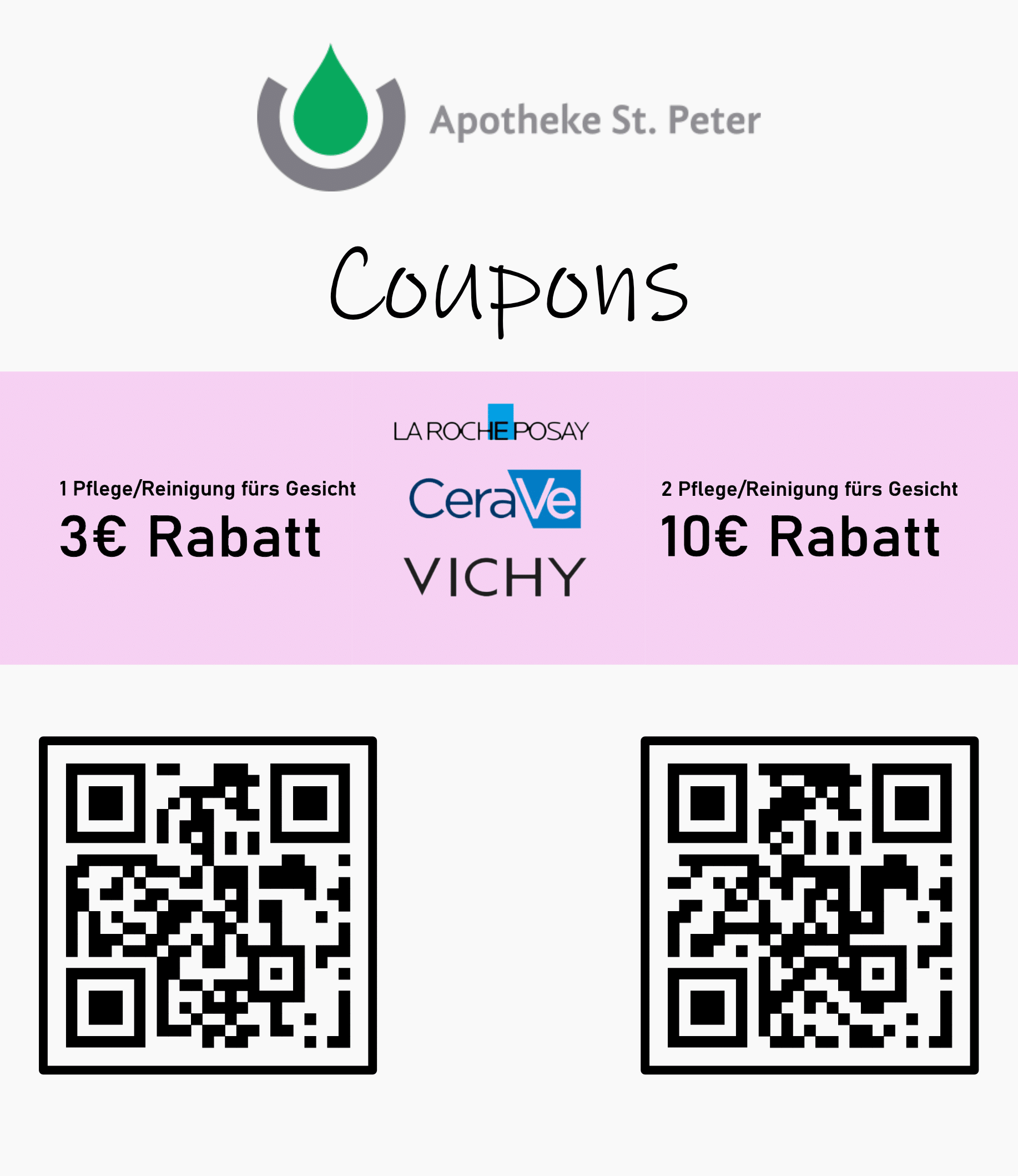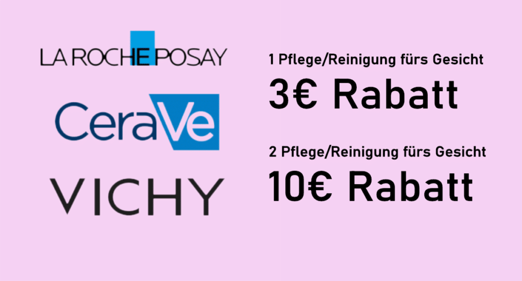 Beim Kauf einer Gesichtspflege oder Reinigung der Marken La Roche-Posay, CeraVe oder Vichy im Wert von mindestens 10 € erhalten Sie 3 € Rabatt gegen Vorlage des Coupons direkt an der Kasse. Wenn Sie zwei Produkte zur Gesichtspflege oder Reinigung der Marken La Roche-Posay, CeraVe oder Vichy im Wert von je mindestens 10 € kaufen, erhalten Sie insgesamt 10 € Rabatt gegen Vorlage des Coupons direkt an der Kasse. Nicht mit anderen Aktionen kombinierbar. Vervielfältigungen werden nicht akzeptiert. Eine Barauszahlung erfolgt nicht. Nur in teilnehmenden Apotheken innerhalb Deutschlands.