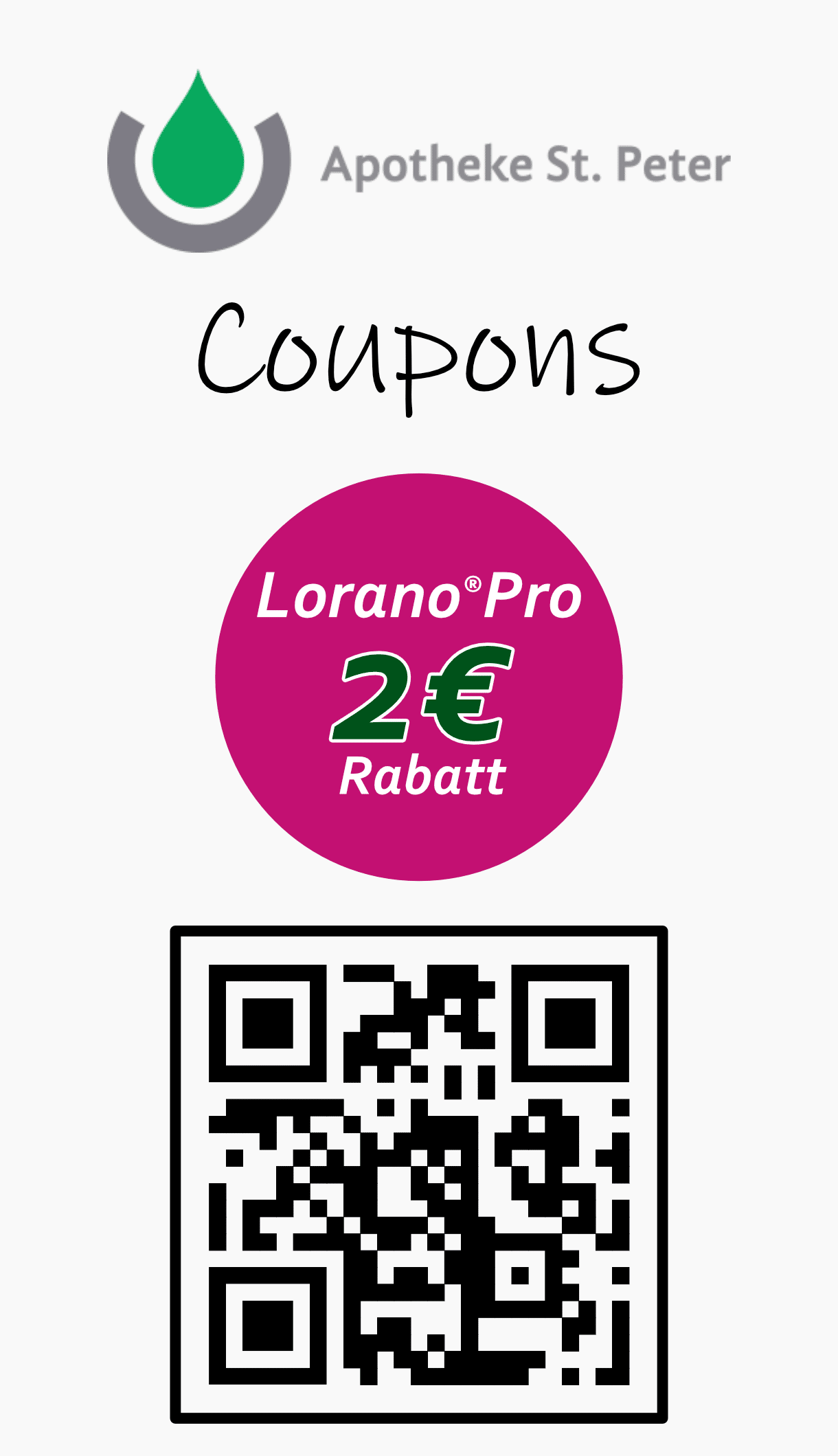 Beim Kauf von Lorano®Pro 18 St. erhalten Sie einen Sofort-Rabatt in Höhe von 2 €. Der Rabatt wird beim Einkauf automatisch an der Kasse abgezogen. Nur ein Coupon pro Packung einlösbar. Nicht mit anderen Aktionen kombinierbar. Vervielfältigungen werden nicht akzeptiert. Eine Barauszahlung erfolgt nicht. Nur in teilnehmenden Apotheken innerhalb Deutschlands. Aktionskontingent ist nur begrenzt verfügbar.
