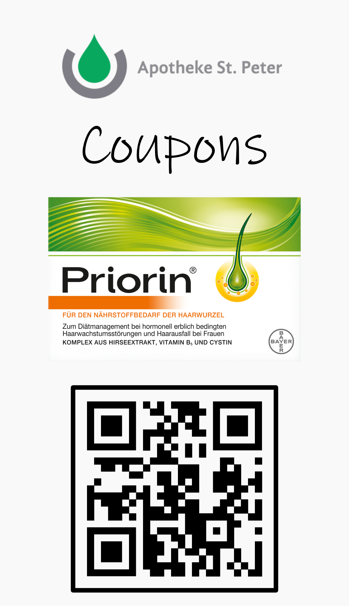 Gültig für alle Priorin® Kapsel Produkte sowie die Priorin® Haarmaske. Beim Kauf von Priorin® Kapseln Packungsgröße 30 St. erhalten Sie 5 € Sofortrabatt, bei Packungsgröße 120 St. erhalten Sie 10 € Sofortrabatt und bei Packungsgröße 270 St. erhalten Sie 15 € Sofortrabatt. Der Rabatt wird beim Einkauf automatisch an der Kasse abgezogen. Nicht mit anderen Aktionen kombinierbar. Vervielfältigungen werden nicht akzeptiert. Eine Barauszahlung erfolgt nicht. Nur in teilnehmenden Apotheken innerhalb Deutschlands.